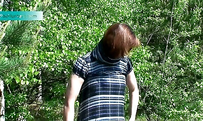 Sassy brunette lady in jeans Rebecca pees in the forest