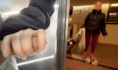 An unknown sporty nymph from the hotel gives me a blowjob in the public elevator and helps me accomplish cumming