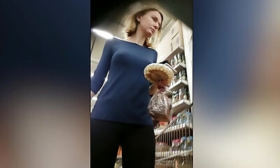 Lovely first-timer chick in blue jeans filmed in the public restroom