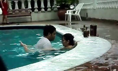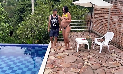 Bare ebony stunner Lala Ivey is swimming in the pool before a nasty sex with her white neighbor